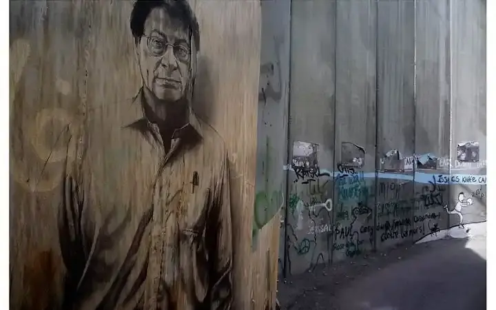 عمل فني: الفتى اللاجئ الأيقوني حنظلة، وغالباً ما يتم رسمه مع أبيات درويش المكتوبة في الخلفية، والتي ترمز إلى المقاومة الجماعية.