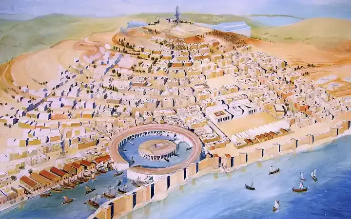 تعود أصول قرطاج إلى القرن التاسع قبل الميلاد، عندما وصل المستوطنون الفينيقيون من مدينة صور إلى ساحل شمال إفريقيا. ووفقًا للأسطورة، أسست الملكة إليسا - المعروفة أيضًا باسم ديدو - المدينة بعد فرارها من الاضطرابات السياسية في وطنها. وسواءٌ أكانت أسطورة أم تاريخًا، فإن قصتها ترمز إلى الشجاعة والطموح اللذين ميّزا قرطاج في سنواتها الأولى. كان الفينيقيون ملاحين وتجارًا بارعين، وجلبوا معهم فهمًا متطورًا للتخطيط الحضري والخدمات اللوجستية البحرية. ومن أبرز إنجازاتهم بناء كوثون، وهو ميناء دائري مصمم للاستخدام التجاري والعسكري. وقد أتاحت هذه المعجزة الهندسية لقرطاج السيطرة على طرق التجارة والدفاع عن نفسها ضد التهديدات البحرية. لعب الدين دورًا محوريًا في قرطاج الفينيقية. إذ تزخر المدينة بالمعابد المخصصة لبعل آمون وتانيت، وهما إلهان مرتبطان بالخصوبة والشمس والحماية. ويحتوي موقع توفه، وهو موقع دفن مقدس، على جرار ولوحات تذكارية تشير إلى تقديم قرابين طقسية - وربما حتى تضحيات بالأطفال، وهو موضوع لا يزال يثير جدلًا أكاديميًا. فهذه الممارسات، على الرغم من جدلها تعكس الصلة الروحية العميقة التي كانت تربط القرطاجيين بآلهتهم وبيئتهم. كانت اللغة البونيقية، المشتقة من الفينيقية، شائعة الاستخدام، وخلّفت وراءها نقوشًا تُقدّم لمحات عن الحياة اليومية، والحكم، والمعتقدات الدينية. استمر هذا التراث اللغوي طويلًا بعد سقوط قرطاج الفينيقية، مؤثرًا على الهوية الثقافية للمنطقة لقرون.