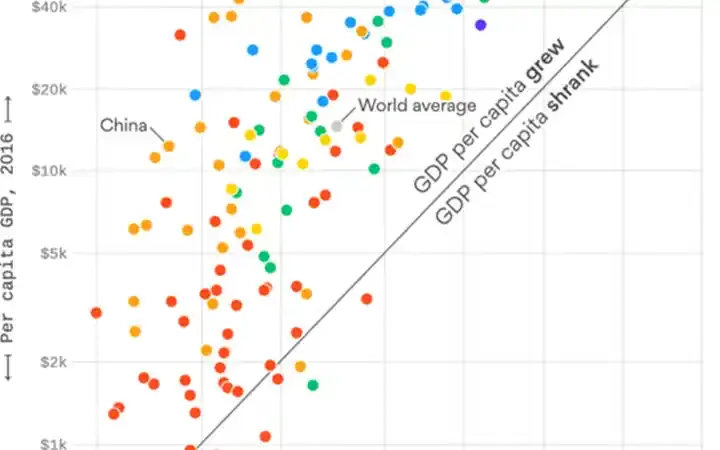 تغير الناتج الإجمالي المحلي بين 1950 و2016 في 134 دولة