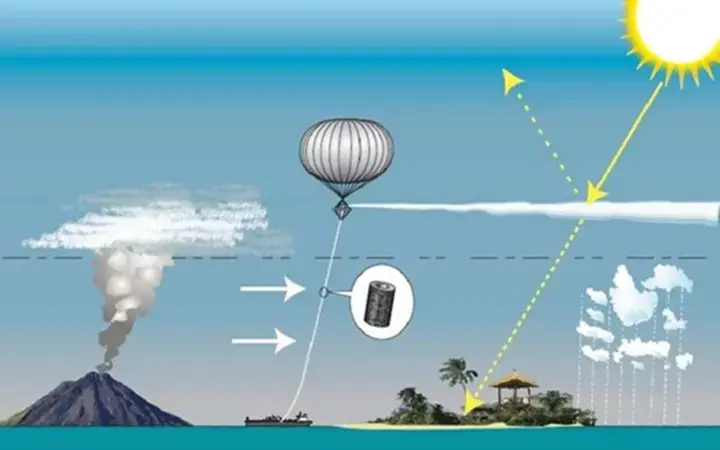• حقن الهباء الجوي الستراتوسفيري (SAI): حقن الهباء الجوي العاكس (مثل الكبريتات) في طبقة الستراتوسفير لعكس ضوء الشمس وتبريد الكوكب بسرعة. تبريد سريع نظرياً، ولكنه ينطوي على مخاطر على أنماط هطول الأمطار وطبقة الأوزون، و"صدمة الإنهاء" في حال توقفه فجأة.