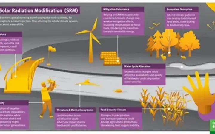 ب. الحوكمة والجغرافيا السياسية- قد يؤدي تطبيق إدارة الإشعاع الشمسي من جانب واحد من قِبل جهة فاعلة واحدة إلى تغيير أنماط الطقس وهطول الأمطار في أماكن أخرى، مما يُؤدي إلى صراع دولي ومسؤولية قانونية. من يقرر بدء أو إيقاف أو تعديل إدارة الإشعاع الشمسي؟ القانون الدولي الحالي جزئي وغير كافٍ؛ ولا توجد آليات حوكمة فعّالة حتى الآن.