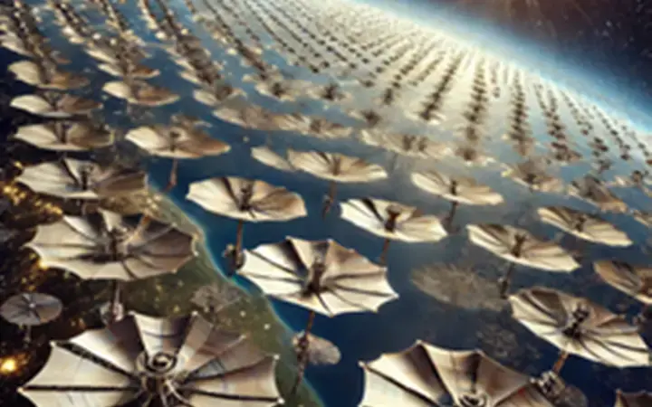توضيح بواسطة الذكاء الاصطناعي مع ملايين المظلات القابلة للتعديل من 1 كم مربع في المدار وتتألف من مادة Kaptonمغطاة بطبقة عاكسة