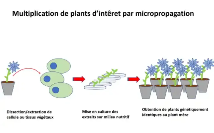 طريقة التكاثر الدقيق: استخراج النسج النباتية ثم زراعتها في وسط مغذّ للحصول على نبتة مطابق وراثيًا للنبتة الأم