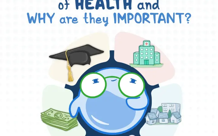 المُحددات الاجتماعية للصحة: التعليم؛ الجوار والبيئة؛ العلاقات الاجتماعية؛ العناية الصحية؛ الاستقرار الاقتصادي.