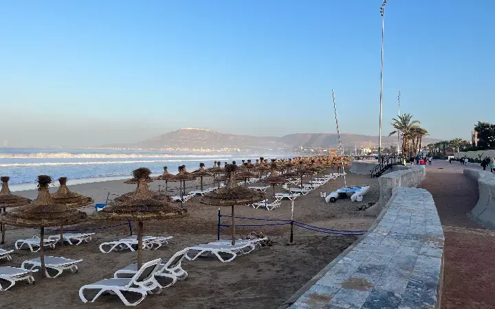 يُعدّ شاطئ أغادير بلا منازع جوهرة تاجها. يمتدّ الشاطئ على طول ما يقارب 10 كيلومترات على ساحل المحيط الأطلسي، وهو واسع ونظيف ومُعتنى به بشكلٍ رائع. رماله الذهبية الناعمة وانحداره اللطيف يخلقان بيئةً جذابة للزوار من جميع الأعمار. فسواءً كنت ترغب في السباحة أو الاستمتاع بأشعة الشمس أو مجرد الاسترخاء، فإن شاطئ أغادير يُوفّر لك المكان الأمثل. من أهمّ مزايا الشاطئ سهولة الوصول إليه. تُقدّر العائلات المناطق الهادئة والضحلة المثالية للأطفال، بينما يستمتع الأزواج بنزهات رومانسية طويلة على طول الشاطئ. يُمكن للمسافرين المنفردين الاسترخاء مع كتاب تحت مظلة أو الانضمام إلى درس في ركوب الأمواج على الشاطئ مباشرةً. كما يُوفّر الشاطئ محطات إنقاذ خلال مواسم الذروة، مما يُضيف مزيدًا من الراحة والأمان.. يُعدّ شاطئ أغادير، بشوارعه المزدحمة بالمقاهي والمطاعم ومحلات الآيس كريم، مكانًا نابضًا بالحياة وهادئًا في آنٍ واحد. يمكنك الاستمتاع بالمأكولات البحرية الطازجة، أو احتساء الشاي المغربي بالنعناع، أو ببساطة مراقبة المارة. ومع حلول المساء، يتلألأ الممشى بإضاءة خافتة، وتصدح الموسيقى من الشرفات القريبة، وتخلق نسمات المحيط العليلة أجواءً ساحرة. أما لعشاق المغامرة، فيُشكّل شاطئ أغادير جنةً حقيقية. تتوفر فيه أنشطة ركوب الأمواج، والتجديف وقوفًا، والتزلج على الماء، والطيران المظلي، مع إمكانية استئجار المعدات وتقديم الدروس مباشرةً على الرمال. كما تجعل رياح المحيط الأطلسي المنتظمة المنطقة مثاليةً لرياضتي ركوب الأمواج الشراعي والتزلج الشراعي. وقد أصبحت القرى المجاورة مثل تاغازوت وتمراغت وجهات عالمية شهيرة لرياضة ركوب الأمواج، تجذب المبتدئين والمحترفين على حدٍ سواء.